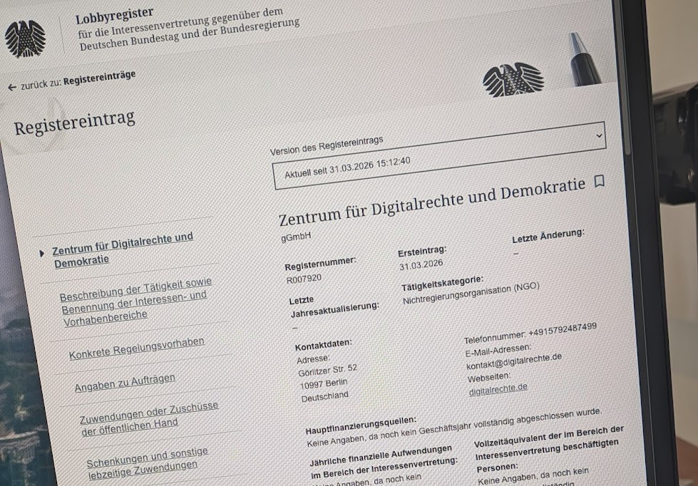 Das Zentrum für Digitalrechte und Demokratie ist keine klassische NGO, kein Lobbyverband und auch kein reines Medienhaus. Wir sind alles davon ein bisschen. Unsere politische Wirkung entfalten wir vor allem über mediale Multiplikatoren. Uns gibt es seit weniger als einem Jahr. Trotzdem haben schon politische Akteure verschiedener Parteien den Austausch mit uns gesucht. Das hat uns positiv überrascht. Wir nutzen jede Chance, um für bessere Gesetze und Rahmenbedingungen zu werben. Das bedeutet auch: Wir betreiben gegenüber der Bundesregierung und dem Bundestag Interessenvertretung im Sinne des Deutschen Lobbyregisters und sind gesetzlich verpflichtet, uns einzutragen. Andere zivilgesellschaftliche Akteure sind aus dem selben Grund auch dort zu finden.